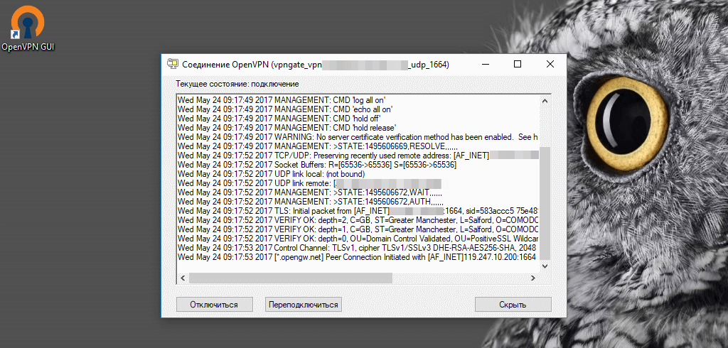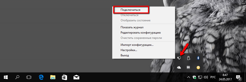 • На иконке OpenVPN жмём правой кнопкой мыши и подключаем ВПН нажав в контекстном меню «Connect»