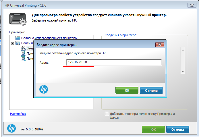 Если Универсальный драйвер, не подошел под ваш принтер, качаем драйвер с сайта производителя лично под него и пользуемся настройкой по ip.