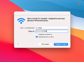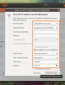 - В соответствующие поля вводим свой логин и пароль LDAP-учетки (в случае с подключением к рабочей сети), нажимаем "Подключиться" (желательно чтобы стояла галочка в чекбоксе "Запомнить эту сеть");
