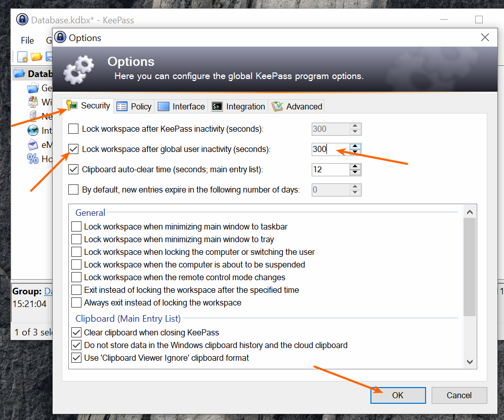 3. Совместно с включенной настройкой из п.2, можно добавить блокировку открытой базы через указанное время, тем самым осуществить ее автосохранение. Для этого так же переходим в 'Tools' → 'Options' и во вкладке "Security" активируем функцию "Lock workspace after global user inactivity", указываем 300 сек. (5 мин.), нажимаем кнопку "Ok". В результате, база паролей сохранит внесенные изменения и заблокируется по истечении 5 мин. бездействия на компьютере.