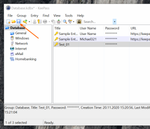При работе с базой паролей в программе KeePass, любые изменения следует сохранять (по аналогии работы с документами Word, Excel и т.д.).