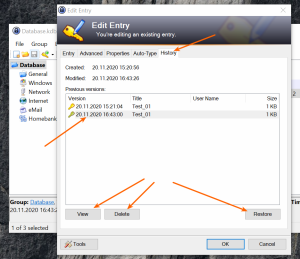 По каждому объекту в базе, во вкладке "History", есть возможность просмотреть версии изменений, а так же соответствующими кнопками сделать восстановление или удаление нужной версии.