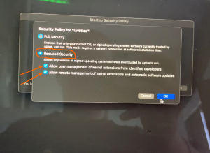 - в новом окне, выберите пункт "Reduse Security" и проставьте все чекбоксы снизу, нажмите кнопку "OK", после применения изменений (окно должно само закрыться) можете делать перезагрузку - сверху на панели нажмите на иконку "яблока" > "Restart".