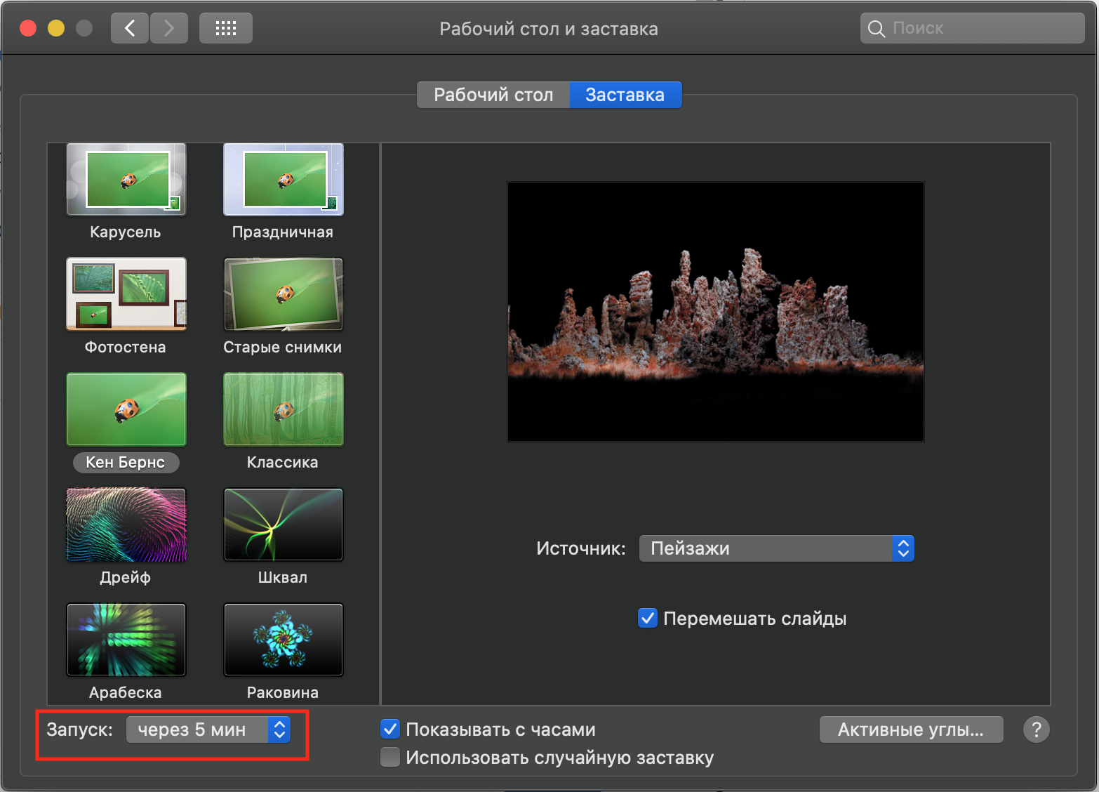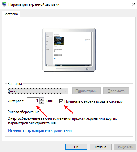 2. Переходим на вкладку Заставка, и ставим время запуска 5 минут:
