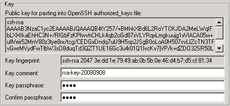 4. Заполняем кодовую фразу и комментарий к нему, копируем текст из Public key for pasting into OpenSSH и передаем его Отделу ОС.