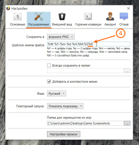 Переходим во вкладку Расширенные и поле Шаблон имени файла в конце добавляем значение "%R", это нужно0 для того, чтобы каждый скриншот имел свое уникальное имя (%R - random).